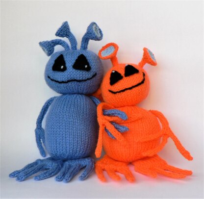 These two 'spaced out' characters are quick to knit using oddments of yarn & simple Knit & Purl stitches. Little Blue Alien stands approx 10 inches (25 cms) tall. His little friend measures 8½ inches (22 cms) from his head sucker to his feet.