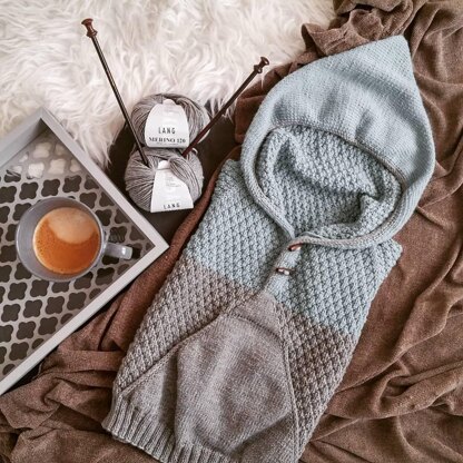 About the pattern: Tyche is a raglan pullover knitted top-down with a hood and a kangaroo pocket in the front. It has a textured stitch pattern all over, with a transition in the seersucker stitch pattern to stockinette at the hood. The pocket is knitted with stockinette stitch all over. Both of the pocket and the hood has I-cord on the edges to make them more attractive. The sample is showing a size 2-4 years hoodie, knitted in 2 colorways: blue (34.0174) and grey (34.0324). The color change happens at the armholes. For inspiration it also worth checking the projects on Ravelry, because my lovely test knitters got really creative with colors!