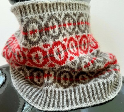 This Fair Isle-patterned cowl features a traditional eight-sided lozenge motif worked in three colors of a super soft blend of Shetland wool and lambswool. The dark grey and red colors alternate in the bands of lozenges that form the body of the cowl.
