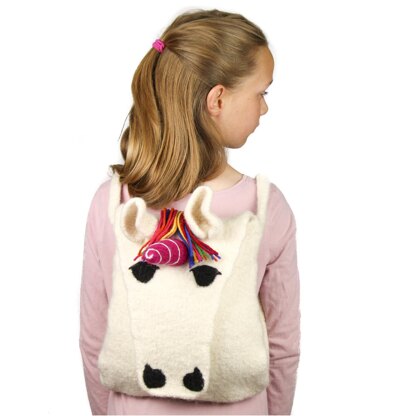 This knitting pattern gives instructions for two sizes of unicorn backpack or bag. It is knitted in a chunky felting yarn (we recommend DROPS Eskimo and have tested this yarn extensively in this pattern to allow for the correct amount of shrinkage) on 8mm needles. The small size bag measures approximately 24cm high by 24cm wide and the large size 32cm high by 28cm wide.
