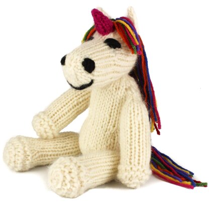 This knitting pattern gives instructions for one size of toy unicorn. However, you can knit him in any yarn size you want, with corresponding needle size, giving a smaller or a larger unicorn.