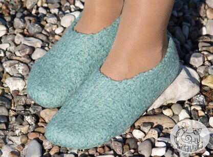 Design details: ● felt slippers ● seamless, worked in one piece ● worked from the heel edging flat ● the slippers toe is worked in the round ● Kitchener st for grafting the last sts on the Toe