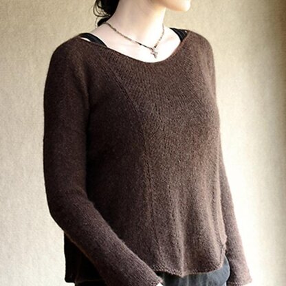 Construction: Sweater is knitted flat from the top down in one piece. Beginning with a provisional cast-on at the neckline, front and back are worked separately. Sleeves are picked up and knitted flat (although they could be modified to knit in the round). Sweater sides and sleeves are seamed.