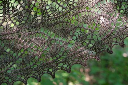 Undergrowth is a top-down triangular shawl with a knitted-on lace edging. The forest theme is echoed in an unusual, leafy lace pattern. Pattern includes both charted and written directions.