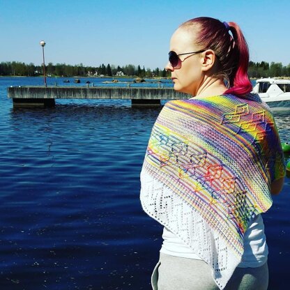 The shawl is worked sideways, adding 1 st every right side row by doing a yo. It consists of 9 different stitch patterns; Stockinette, Honey Comb and reverse Honey Comb, Linen Stitch and Half Linen Stitch, two different Lace, Slipped Cables and Mosaic Cables.