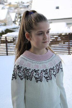 The unicorn is a legendary creature that has been described since antiquity as a beast with a single large, pointed, spiraling horn projecting from its forehead. Every little girl loves unicorn. Who can blame them? Pretty and magical is hard to resist. This round yoke sweater is knitted top down in one piece. The unicorns are explained by chart and the rest of the pattern is written.