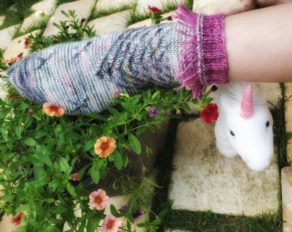 You, too, can be part of the Unicornucopia- meet a new friend or a new combination of colors. These socks use slip stitches and helical stripes to make unicorns for your feet- complete with sparkle and a fringed mane