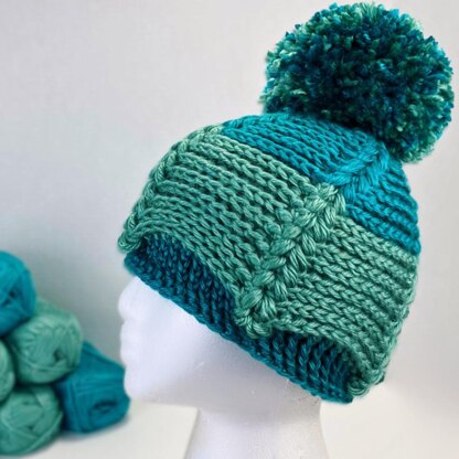 This beanie uses Wander acrylic yarn by Furls in the colors Atlantis and Tundra. Known for its soft feel and vibrant colors, Wander yarn offers great stitch definition, allowing the intricate puff and post stitches to shine.
