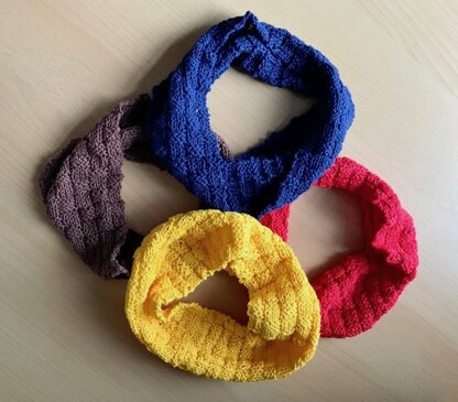 This is a shorter type unisex cowl that is incredibly easy to wear. It can be worn as a regular cowl over a top and will be short enough to be out of the way for work, etc, or it can be worn tucked beneath a top or sweatshirt, with only the neck part visible. It is equally versatile in choice of yarn, the cowl can be made, as in the photos here, in Paintbox Yarns Cotton DK, suitable for sensitive skin, or for more warmth choose either Paintbox Yarns Baby DK or Paintbox Yarns Simply DK.