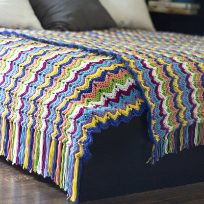 With two sizes and a knit or crochet version to choose from, Colorbloom Afghan Kit has plenty of options. Each kit includes the printed pattern and enough yarn to make either one large blanket or two smaller blankets. Both versions of the blanket are worked lengthwise in a striped ripple pattern. Best of all, there are no ends to weave in as they become the fringe!