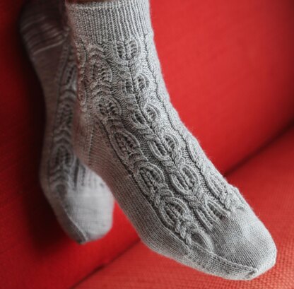I love the look of cables mixed with lace, especially for socks. These cables are not difficult, but they can be a bit fiddly to work in finer sock weight yarn. Alternating the direction of the cables creates lovely undulating columns. The cable pattern pulls in a good bit on the cuff, so make sure you pay attention to sizing, or work the cuff in a larger needle size if you are worried about it being too snug. These socks are worked from the cuff down, with a tubular cast on leading into the 1x1 ribbing. Two sizes are included.
