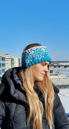 Up and down geometric snowflake design. A fun styled headband at a beginner level using only 2 coloured yarns.