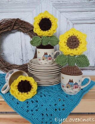 How to crochet a cute, potted sunflower using any size pot or upcycled coffee mug. I am sharing instructions for a mug my size, but I am also going to explain how to adjust it to custom fit. There is a video tutorial included. You'll need some worsted weight yarn, I used Red Heart Super Saver in the Coffee/Cafe Latte (42 Yards), Tea Leaf (10 Yards) and Bright Yellow (25 Yards) colorways. You'll also need a H8/5mm crochet hook, tapestry needle, soft tape measure, stuffing, pot or mug and then pipe cleaners are optional for extra support. For reference, I had mine ready in just under 1 hour, 15 minutes. Gauge is essential for the proper fit, and following my mug, is measured in the round starting with 10 HDC and increasing to 30 HDC, 30 HDC = 3" in diameter.