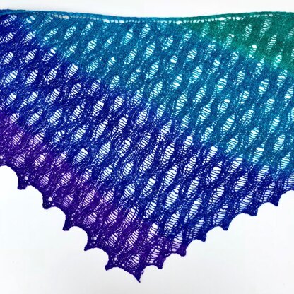 The picot edges of the shawl are created by casting off stitches at the start of a row on one side, and by a bind off at the end. The pattern is supported by video tutorial which walks through how to do this step-by-step.