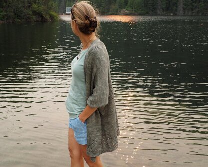 This modern look cardigan is must to have piece in the wardrobe of every city girl. It worked seamlessly from top down using modified raglan construction and featuring the lacy back.. The fabric drapes nicely and has little sheen because of combination of silk and ramie. This design is result of collaboration with Skudderia yarn dyed in Germany.