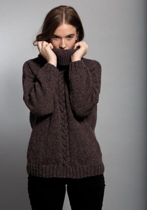 A classic lightweight sweater with a single cable at the front and cowl collar.