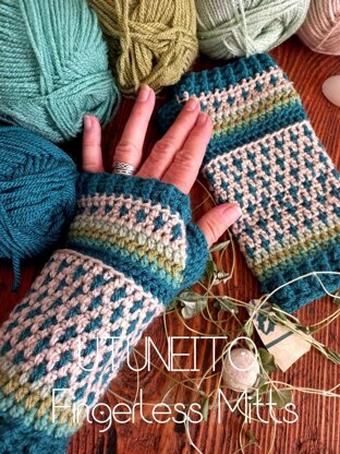 DESCRIPTION: A pair of Finnish folklore-inspired texture-rich fingerless mitts. Perfect for a quick stash-busting project.