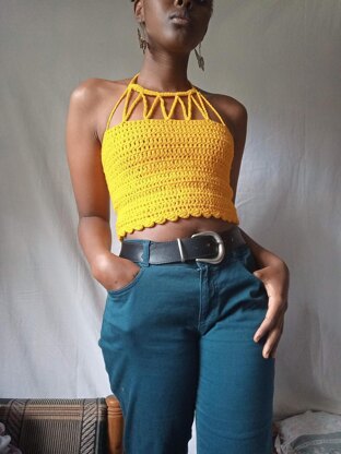 Since the yarn is light in weight I doubled it up and used two strands. The color used in the crochet top is mustard yellow, but the top goes well with any other bright colors, i.e., red, turquoise, blue, orange, and nude brown. These are just a few of my recommendations, but the colors can be varied on a wider scale.