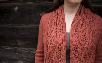 The focal point of this cozy cardigan is the wide shawl collar worked in a charted lace and cable pattern. The top-down construction starts with the collar, then leads to picking up stitches for the back and sleeves. The body incorporates contiguous sleeve cap shaping. To maintain the uninterrupted flow of the shawl collar, the bottom edge of the lace and cable pattern descends into chevron points.