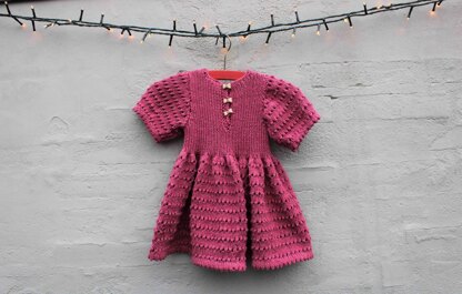 The dress has a round neckline and buttons at the top of the back. This pattern is made for at yarn with a gauge of 26 stitches per 10 centimeters (stockinette stitch), i.e. a yardage of approximately 140-150 meters per 50 grams..