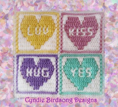 This pattern is for an overlay mosaic crochet square featuring Valentine's Conversation Candy hearts which can be used in other types of projects, such as blankets, pillows, satchel bags, table mats, etc.