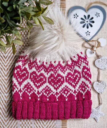 Valentine Hat plays with the theme of hearts. Heart shapes snuggle between playful geometric motifs. There are three variations of hearts to choose from, and the pattern also features a reverse colour chart.