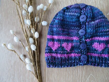 This fun hat knits up fast. Just the thing to set your heart aglow for Valentine’s Day (but still wear your ponytail the way you want!)
