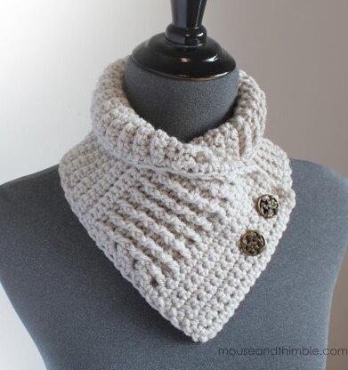 This double breasted buttoned V-shaped neck warmer will tailor neatly under coat lapel or atop a turtle neck sweater to ward off the chill of winter both indoors and out. Easy button closure allows for quick cold to warm transitions. Crochet beautiful thermal texture by simply working into back loops or around the posts of basic stitches (ch, sc, dc, slst). Abbreviation key with descriptions, included.
