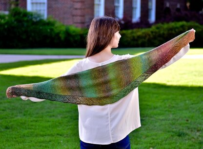 3 balls of Jojoland Melody Superwash yarn in color MS104. About 550 yards being used. It is knitted sideways with lace edging knitted on to shawl body.