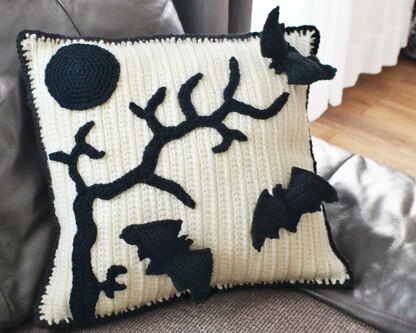 Halloween theme square cushion cover with the black tree, moon and flying vampire bats. The pattern is written in English, UK crochet terms.