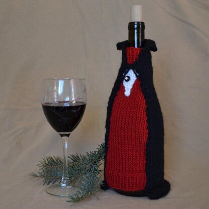 This is the third in a beautiful series of decorated wine, champagne and theme liquor bottle sweaters. I love this Vampire design for red wine bottles. It is worked in 3 parts: front bottle sleeve in red, cape in black and shirt front in white. A small rhinestone tux button accents the shirt. It makes beautiful gift wrap or decoration on the liquor shelf. Bottle sleeve is knit from worsted weight yarn, shown in Lambs Pride. This sweater is designed for 10 ¼ inch circumference bottle, but easily adjustable for taller bottles. I left bottom open so bottle sits flat and I left top of neck open for easy pouring. Also fits S. Pellegrino 750ml water bottles if kit ½ inch taller. Arms are knit as I-cord.