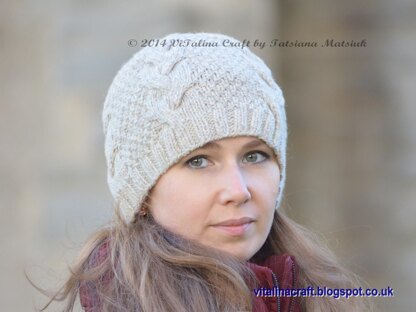 Vanilla Cloud Adult hat is a stylish and beautiful accessory for the winter time. This beanie is comfortable to wear and fancy to knit. The hat is knitted with Peruvian wool in vanilla color. The simple braided cable pattern with moss stitch sectors makes this beanie a great project for those who love cables. Thick yarn and large size of knitting needles make this project quick and easy to knit.