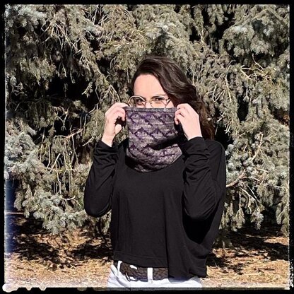 The Dark Crystal film has been a favorite of mine since it was released in 1982. When The Dark Crystal: Age of Resistance aired, I was enthralled. It’s not surprising the rich imagery and captivating story inspired me to design. This cowl is inspired by the Vapra Gelfling Clan who live in the mountain region of Thra. Their emblem is grey and deep purple. Majestic purple mountains float amongst the grey clouds framed in neat I-Cord edging.