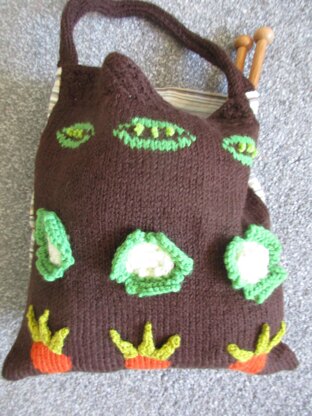 This is a pattern for a vegetable patch project bag or shopper. It is worked in stocking stitch with intarsia motifs with applique and embroidery, with mini bobbles on the cauliflower. The top border is in bramble stitch and the handle in stocking stitch. The sample has a fabric back and lining. The pattern includes a plain knitted back version.
