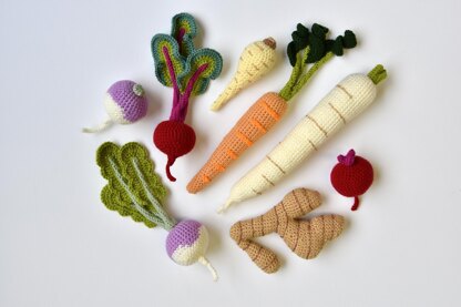 With this pdf crochet pattern you can make your very own root vegetables amigurumi set! This pattern set features the following crochet patterns: - beetroot or beet crochet pattern - turnip crochet pattern - ginger root crochet pattern - large carrot crochet pattern - rettich crochet pattern - parsnip crochet pattern