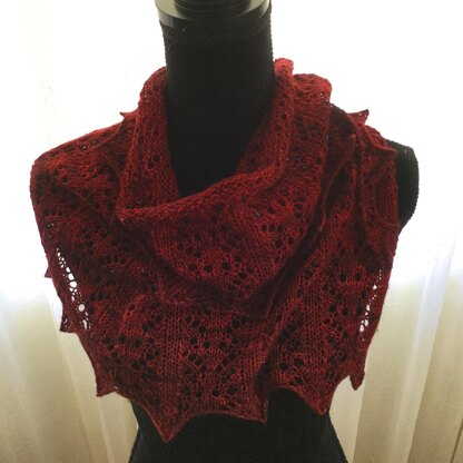 This is long asymmetrical triangle lace shawlette. There is a small amount of beading to add drama. This shawlette uses yummy Madelinetosh "Tosh Sock" in dark red Tart color. The edge has sharp scallops to further add to the overall theme.