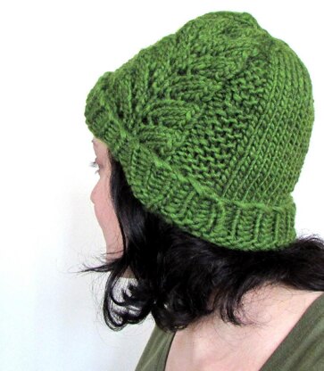 The hat features ribbed edging and a leafy lace panel over a garter stitch background. The rest of the hat is knit in easy stockinette stitch. The edge can either be worn down for a slouchy look or rolled up for a shorter beanie look.