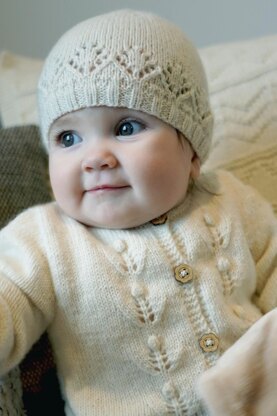 The Verity cardi and hat are knitted with 4ply weight yarn, floral lace and bobbles details are featured on the fronts and sleeves. Teamed up with a lace patterned hat, which has two versions, knitted flat on straight needles or on the round on double pointed needles.