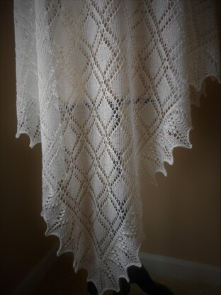 Estonian styled lace shawl knit in a triangular shape. Center body is worked first from the bottom up in a double eyelet diamond pattern. The 7-stitch nupp and bead accented lace border is then picked-up and knit in the round.
