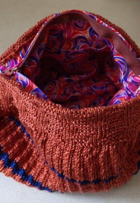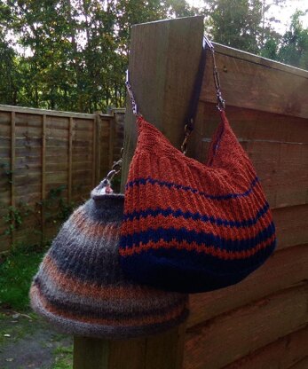Pattern includes full instructions to create a handbag using fingering, long-change variegated yarn or two colours of sport weight yarn. Construction details can be combined in order to create different models. Bottom is worked flat, the rest is worked in the round in an easy, quick stitch pattern using slipped stitches that create a wavy effect. The yoke of version A is worked in plain stockinette, whereas version B features a knit/purl zigzag pattern. Two tabs hold D-rings to which a strap is attached with snap hooks. Version A uses 70g of the suggested yarn. Version B uses 1 ball of blue yarn and 1 1/2 balls of rust yarn. Additional colours can be used if desired. Sample bags feature a woven fabric lining with zipper. Pattern includes full instructions to sew a lining with pocket and zipper to fit each version. See schematic in Photos section for more information on the dimensions.
