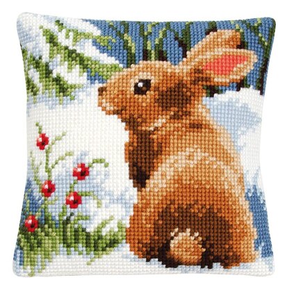 Cross stitch cushion kit Hare - Cross Stitch Kit, Hand painted large hole canvas: 100% cotton, Thick Yarn: 100% acrylic, 18 holes/10 cm - 4,5 stitches/inch, Instruction in eight languages, Needle, Frontsheet picture.