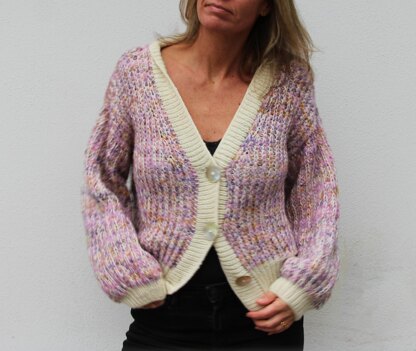 VesterbyCrea No.25 is a jacket/cardigan worked in half fisherman´s rib. It is a top-down model. The back piece is worked in half fisherman´s rib at the beginning of the yoke. The front pieces are worked one by one with increases. The front pieces are worked flat in the same way as the back piece in half fisherman´s rib. The body is worked flat in half fisherman´s rib by joining the back and front pieces. The body is finished with a wide ribbing and stretchy bind off. Sleeve stitches are picked up along the armhole and worked in the round in half fisherman´s rib and finished with a ribbing and stretchy bind off. Button bands are worked in ribbing with 4 buttonholes. Button bands are sewn together in the neck to create a bent edge.
