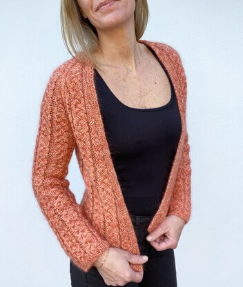 VesterbyCrea No 39 is a cardigan worked in pattern and raglan increases. In the beginning of the yoke cast on using provisional cast on method for neckline which is worked in ribbing. The yoke is worked flat in pattern and raglan increases and increases for the front pieces until dividing for body and sleeves. The body is then worked flat in pattern and finished with a ribbing and bind off. The sleeves are worked in pattern using the stitches placed on hold and the extra stitches that are picked up in the armhole. The sleeves are finished with a ribbing and binded off using tubular italian bind off method. The neckline is finished by picking up the stitches from the provisional cast on and then binded off using horizontal stitches. The cardigan is assembly free.