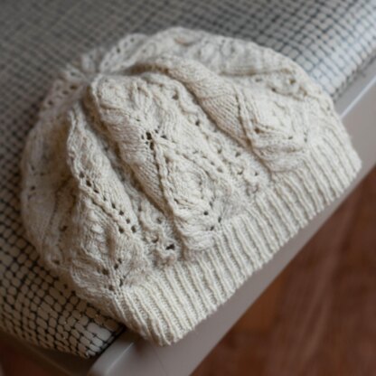 Victoria is a knitted beret covered in a lacey motif reminiscent of budding flowers, leaves and vines. It is worked from the bottom up in the round and contains instructions in both written and charted formats.