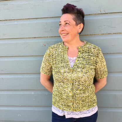Vigsla Cardigan has an all-over lace which takes advantage of the shifting colorway. This is perfect for cool spring, summer, and fall days! You may choose to knit long or short sleeves, as directions are included for both.