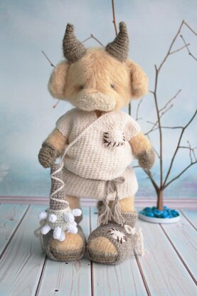 to crochet a beautiful outfit and weapon. The finished product using the materials stated in this pattern is 13.3’’ from the hooves to the horns. Our bull sits and stands on itself. Please, note, that the size of the toy may differ if using different yarn brand or weight matches. The pattern consists of 46 pages and contains over 140 photographs and charts. The clothes are removable and made with a hook. A set of clothes for a Viking toy consists of: a beautiful elongated tunic with a belt at the waist, worn boots with patches, and a homemade weapon mace.
