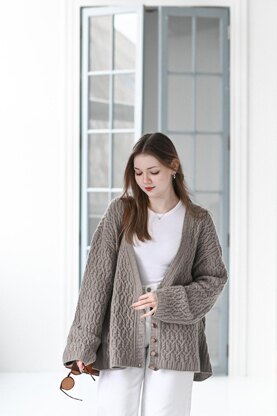 “Vinca” cardigan is worked seamlessly from the neck down. First, the Back Yoke is worked, the stitches for the Fronts are picked up along the shoulder line and the two halves of the Front worked, then the V-neckline is shaped. The sleeves are worked from the armhole down, a subtle sleeve cap is added through short row shaping. The garment is finished by working the neckline edging and button and buttonhole bands in a ribbing pattern.
