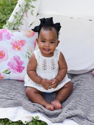 A knitting pattern of a darling child’s dress in three sizes featuring a deep lace hem and bodice.