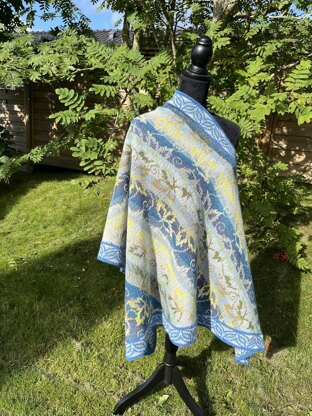 The shawl is knitted in the rounds with steek stitches. You onlynknit with two colors at a time