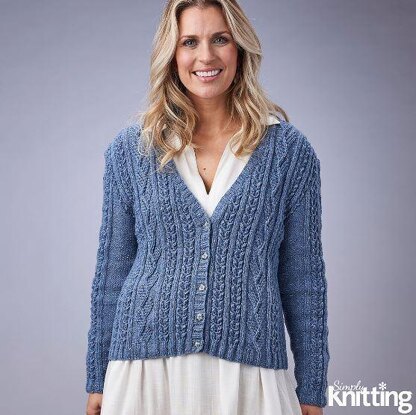 This is a pattern for a vine stem cardigan, originally published in Simply Knitting. It has a vine stem stitch with a cable, and 2 x 2 rib edges. Photo Simply Knitting.